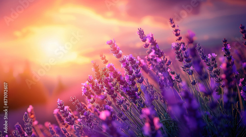 © patungkead, Naklejka premium A mesmerizing digital art piece featuring a lavender flower field at sunset with fresh purple blossoms glowing in the dreamy, ethereal light.