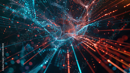 © VK Studio, Naklejka premium A mesmerizing digital network of blue and red particles against a dark background visualizes the dynamic and interconnected nature of modern technology and data flow.