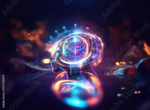 © joeycheung, Obraz premium A mesmerizing double exposure image: a glowing orb, seemingly containing a face, rests on a dark, reflective surface amidst swirling, vibrant energy.