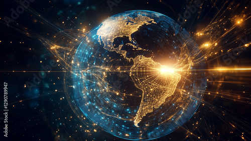 © Qaiser, Obraz premium A mesmerizing holographic Earth, pulsating with bright golden and sapphire-blue data streams