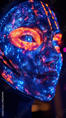 © Jnnwt.C, Naklejka premium A mesmerizing illuminated mask glows with vibrant colors and intricate patterns, blending art and technology in an eye-catching display.