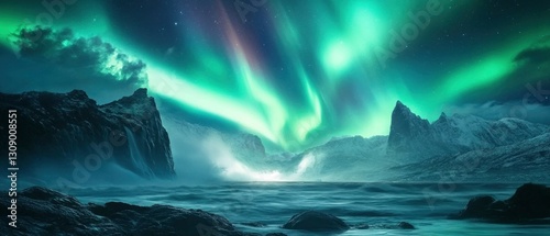 Naklejka premium A mesmerizing night scene of the Northern Lights dancing across the Arctic sky above the snow-covered peaks