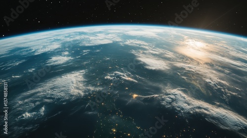 Fototapeta premium A mesmerizing perspective of Earth's surface, highlighting its vast water bodies and cloud formations, representing the planet's natural beauty and serenity.