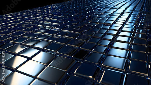 Naklejka premium A mesmerizing perspective showcases a vast metallic surface composed of a grid of reflective cubes, rendered in a striking grayscale palette.