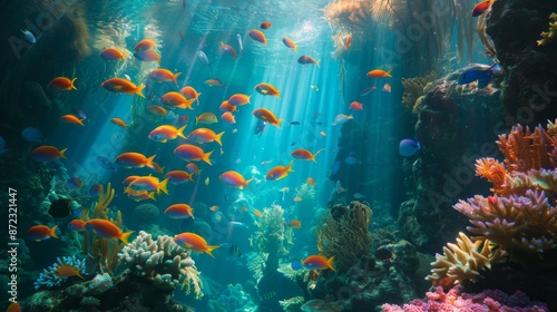 Fototapeta premium A mesmerizing scene of tropical fish swimming in an underwater paradise filled with diverse and colorful coral formations, illustrating the vibrant marine environment.