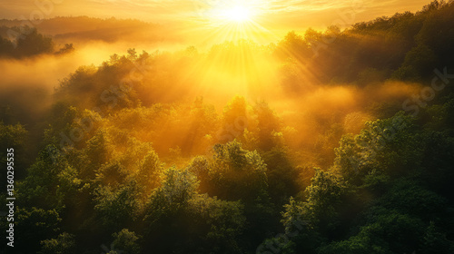 © Farid, Naklejka premium A mesmerizing sunrise casting golden light over a lush green forest