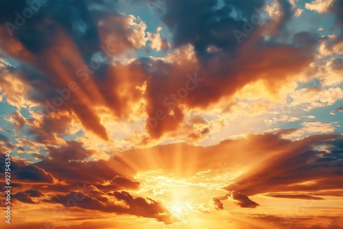 Fototapeta premium A mesmerizing sunset casting vibrant colors and radiant sun rays through the clouds, creating a picturesque sky view.