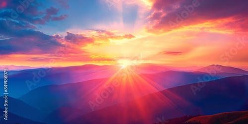 Fototapeta premium A mesmerizing sunset over mountain peaks with rays of sunlight piercing...