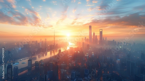 Fototapeta premium A Mesmerizing Sunset Reflecting off a Winding River in a Cityscape.