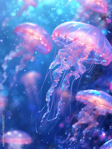 Naklejka premium A mesmerizing underwater scene celebrating World Jellyfish Day, with a...