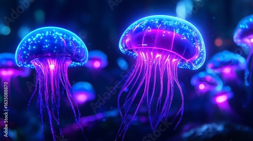 Fototapeta premium A mesmerizing underwater scene featuring glowing jellyfish with vibrant neon...