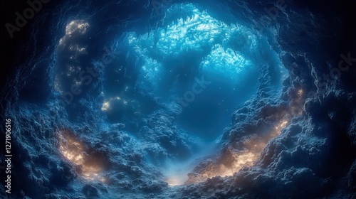 © sompoch, Fototapeta premium A mesmerizing underwater scene illuminated by ethereal blue light, revealing swirling patterns and hints of distant celestial bodies.