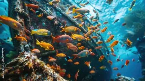 © Athiphat, Fototapeta premium A mesmerizing underwater scene of a sunken shipwreck covered in coral and teeming with vibrant tropical fish. The clear blue waters