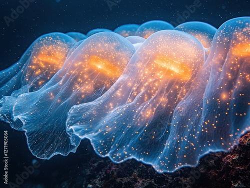 Obraz premium A mesmerizing underwater scene showcasing glowing jellyfish drifting...