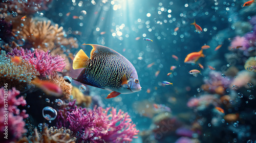 © Osadchyi_I, Obraz premium A mesmerizing underwater world teeming with vibrant coral and fish in a sunny, blue environment.