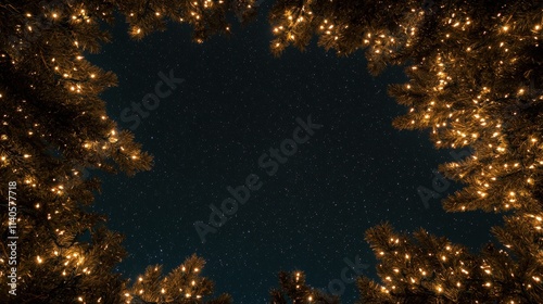 Naklejka premium A mesmerizing view of a starry night framed by twinkling lights from surrounding trees, creating a magical, serene atmosphere.