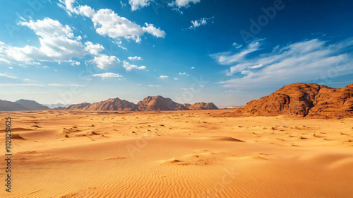 © GoldPumaze, Fototapeta premium A mesmerizing view of a vast desert stretching into the horizon under a clear blue sky.