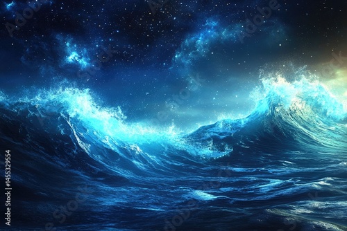 Fototapeta premium A mesmerizing view of tumultuous ocean waves illuminated by a cosmic night...