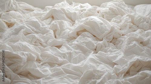 © Дмитрий Петров, Obraz premium A messy bed with white sheets and rumpled blankets.