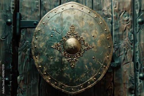 © Fotograf, Naklejka premium A metal shield hangs on a wooden wall, ready for display or protection