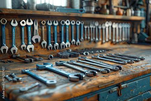 © Kitta Studio, Naklejka premium a metal tool with a screwdriver on it and some other tools on the table.