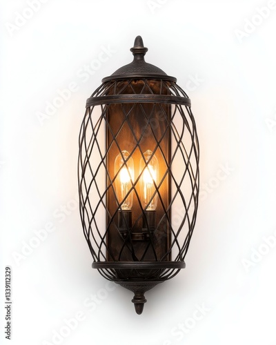 © Jardel Bassi, Naklejka premium A metal wall lamp with three bulbs, casting warm light inside the iron cage over a white background. The entire body is made of black bronze material and has an ancient European-style pattern on it.