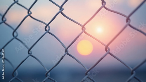 Fototapeta premium A metal wire fence's intricate pattern frames a hazy sunset, creating a...
