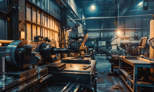 Naklejka premium A metal work shop equipped with CNC (Computer Numerical Control) machines used for precision metal cutting and shaping.