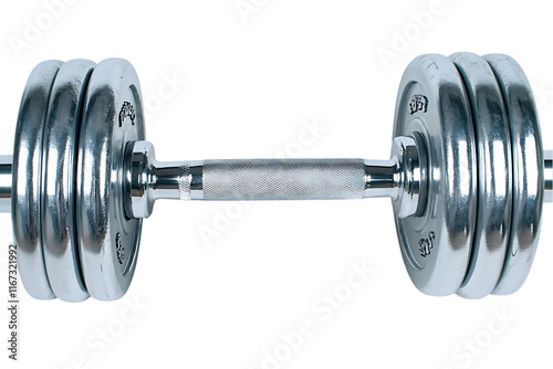 Naklejka premium A metallic dumbbell with multiple weight plates for strength training exercises.