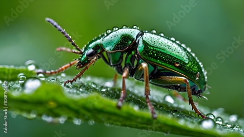 © Ushan, Fototapeta premium a metallic green beetle resting on a dewy leaf, perfect for macro nature themes.