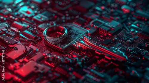 Fototapeta premium A metallic key resting on a vibrant circuit board, symbolizing cybersecurity,...