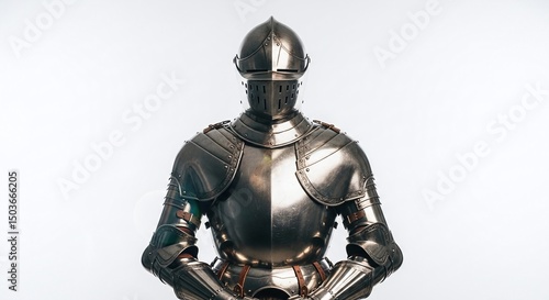 © Gilang, Fototapeta premium A metallic knight armor on display with intricate details, showcasing historical craftsmanship. This historical artifact tells a tale of protection, valor, and chivalry