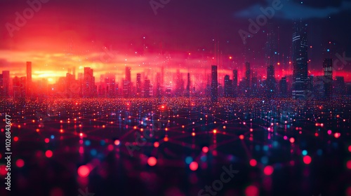 © huynh, Fototapeta premium A metaverse-inspired smart city connected with lines and dots, showcasing big data and advanced technology in a digital cityscape background.