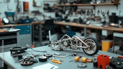 Fototapeta premium A meticulous motorcycle model assembly lies amid an array of tools in a workshop, showcasing craftsmanship and precision in a creative environment.