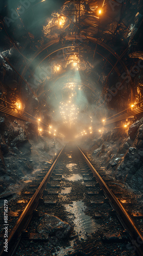 Naklejka premium A metro station under construction with dust clouds from drilling and excavation, realistic, high detail, 8k