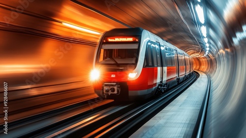 © Pornnapa, Fototapeta premium A metro train speeding through an underground tunnel