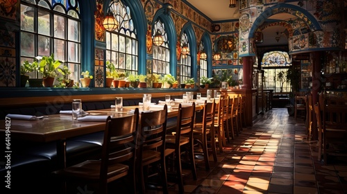 Fototapeta premium A Mexican restaurant in the sunlight with empty tables. Generative AI.