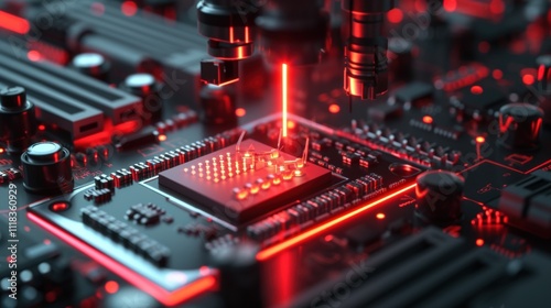 © Justlight, Obraz premium A microchip being programmed by an AI algorithm within a manufacturing machine ensuring accurate and consistent production of electronic components.