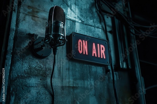 Fototapeta premium A microphone is in front of a neon sign that says on air