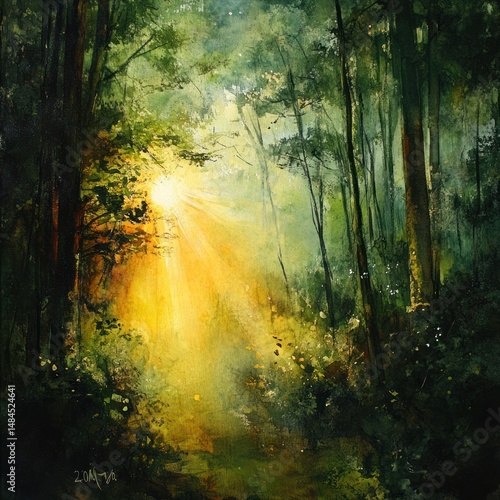 © HO, Fototapeta premium A mid-morning golden burst of light flooding a green woodland.