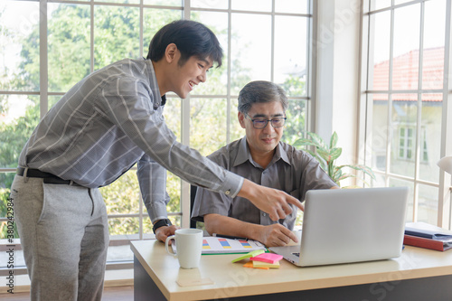 © Prasong Takham, Fototapeta premium A middle-aged Asian man teaching his son a job standing next to a desk in an office.
