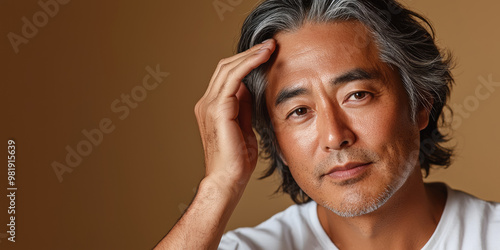 Fototapeta premium A middle-aged man with gray hair touching his head, generative AI