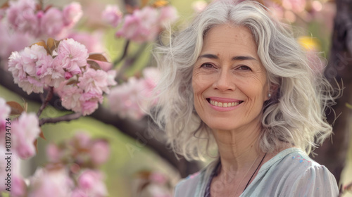 © Duka Mer, Fototapeta premium A middle-aged woman smiles in front of blooming cherry blossoms, dressed stylishly in soft pastel colors that complement the pink flowers.