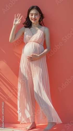 Fototapeta premium A middleaged pregnant Asian woman standing with on 130 dress, woman, fashion, beauty, model, long, hair, gown, glamour, person, elegance, bride, wedding, evening, elegant, people, red, lady, one, stu