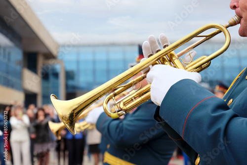 © SKfoto, Obraz premium A military brass band plays on a city street.