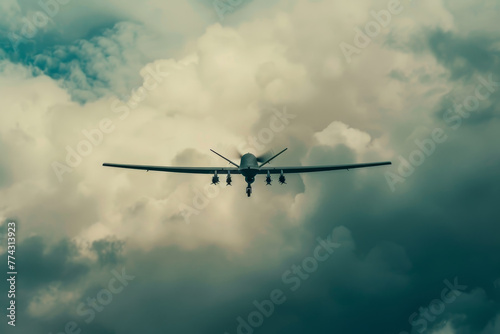 © Formoney, Fototapeta premium A military drone flies through a cloudy sky