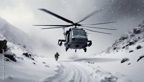 © abu, Obraz premium A military helicopter flies low over a snowy mountain pass during a snowstorm. Two soldiers, one Black and one Middle-Eastern, disembark into deep snow, setting up a perimeter as heavy snowflakes swir