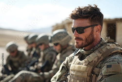 © Sanchai, Fototapeta premium A military officer briefing soldiers with a serious and focused tone