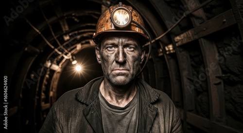 Naklejka premium A miner wearing a hard hat stands inside a dark, industrial tunnel with...