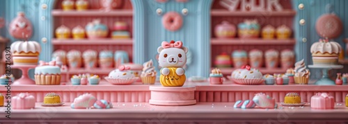 © Sarin, Naklejka premium A miniature scene of the cute bear with bread shop, featuring a table filled with various types of pastries and cakes, along with an open oven for baking fresh cookies